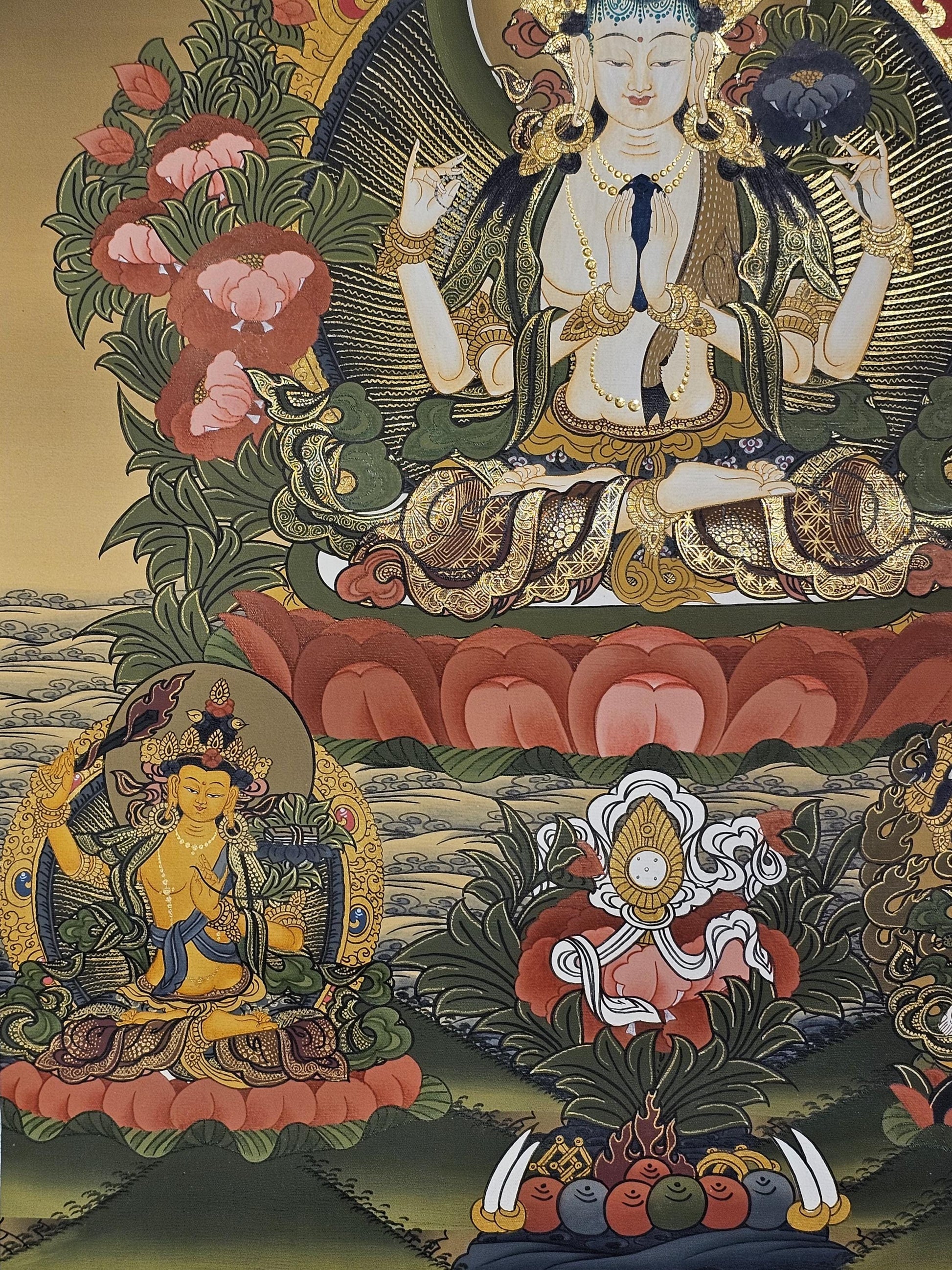 Chyangresi Thangka Hand-Painted | 41x56 cm Avalokiteshvara Tibetan Wall Art | Traditional Nepalese Buddhist Painting | Spiritual Decor